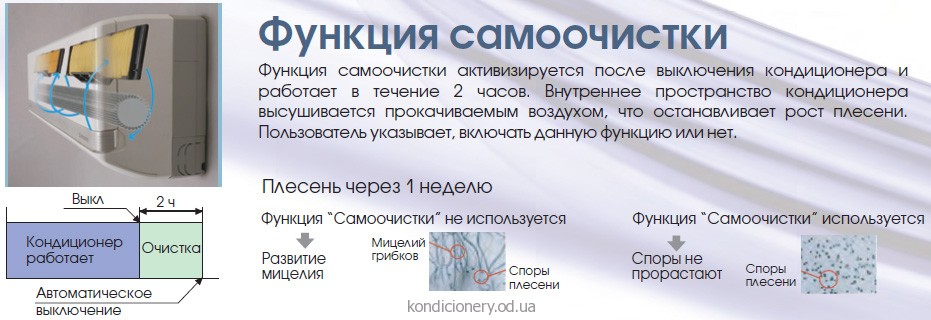 Фильтрация воздуха от пыли и прочих бытовых аллергенов происходит благодаря наличию моющегося воздушного фильтра. Чтобы поддерживать в чистоте составляющие внутреннего блока, в системе предусмотрен режим самоочистки. Он запускается самостоятельно после прекращения работы системы и в течении 2 часов просушивает все внутренние части прокачиваемым воздухом. Это позволяет высушить скопившийся конденсат и предупредить появление плесени.